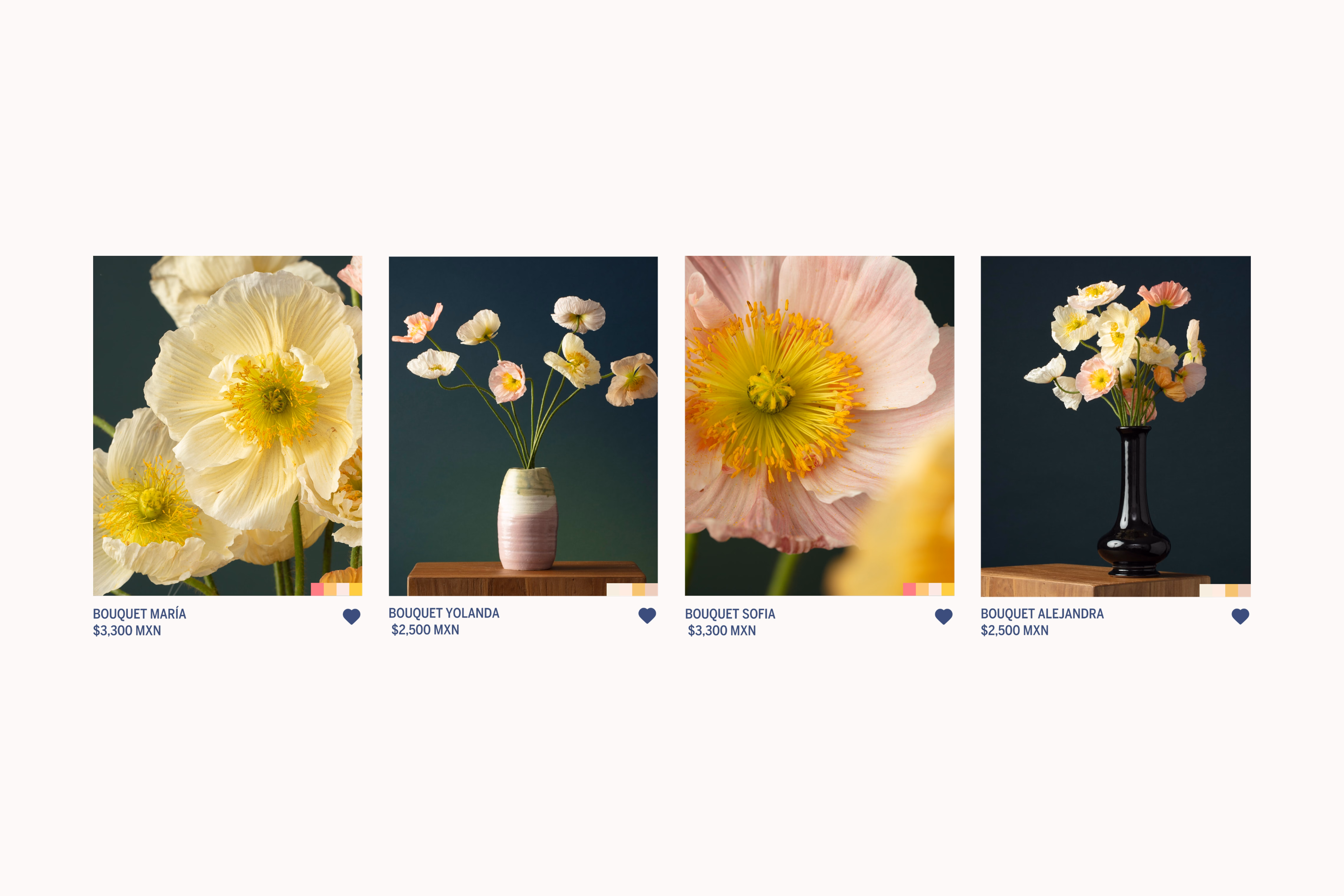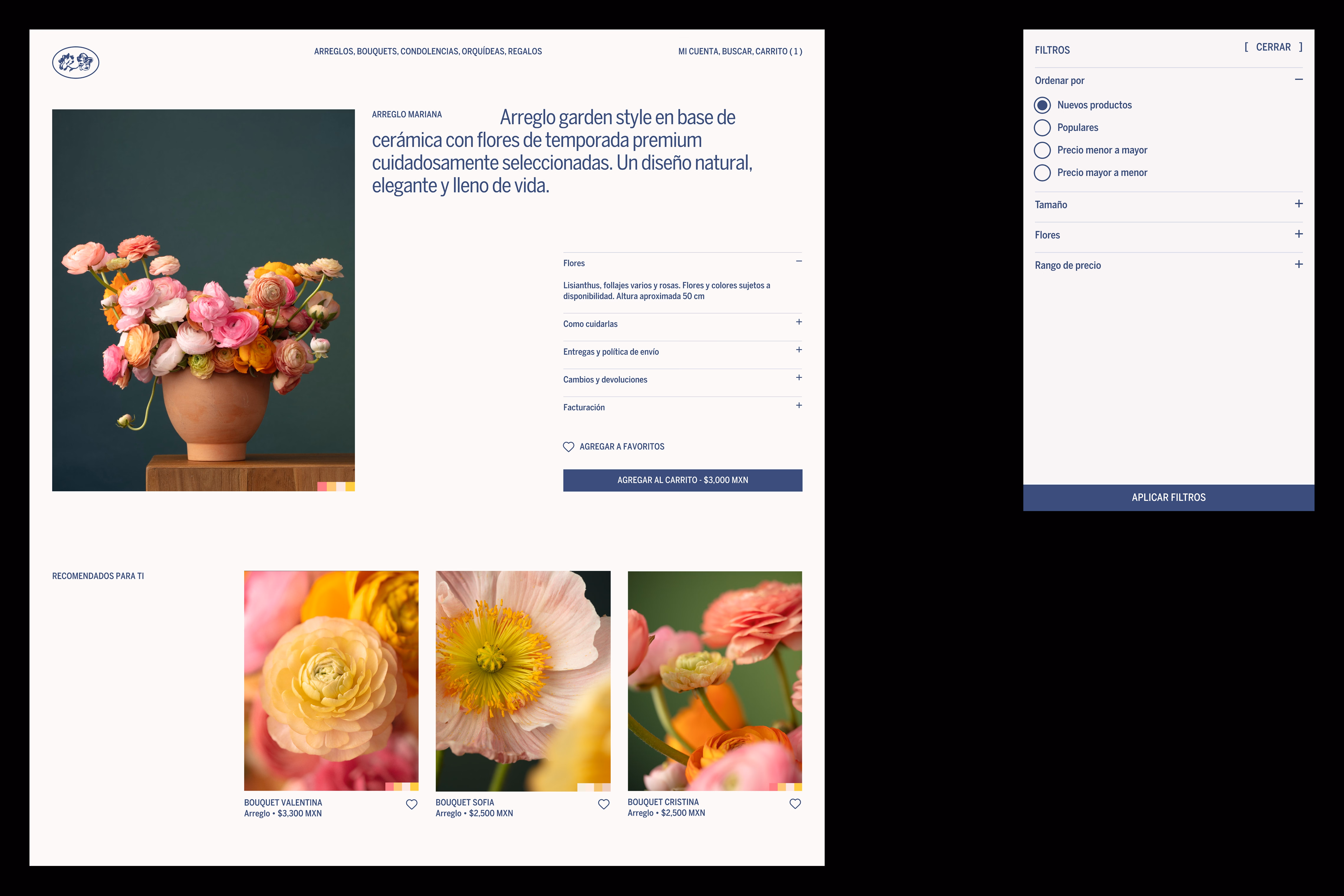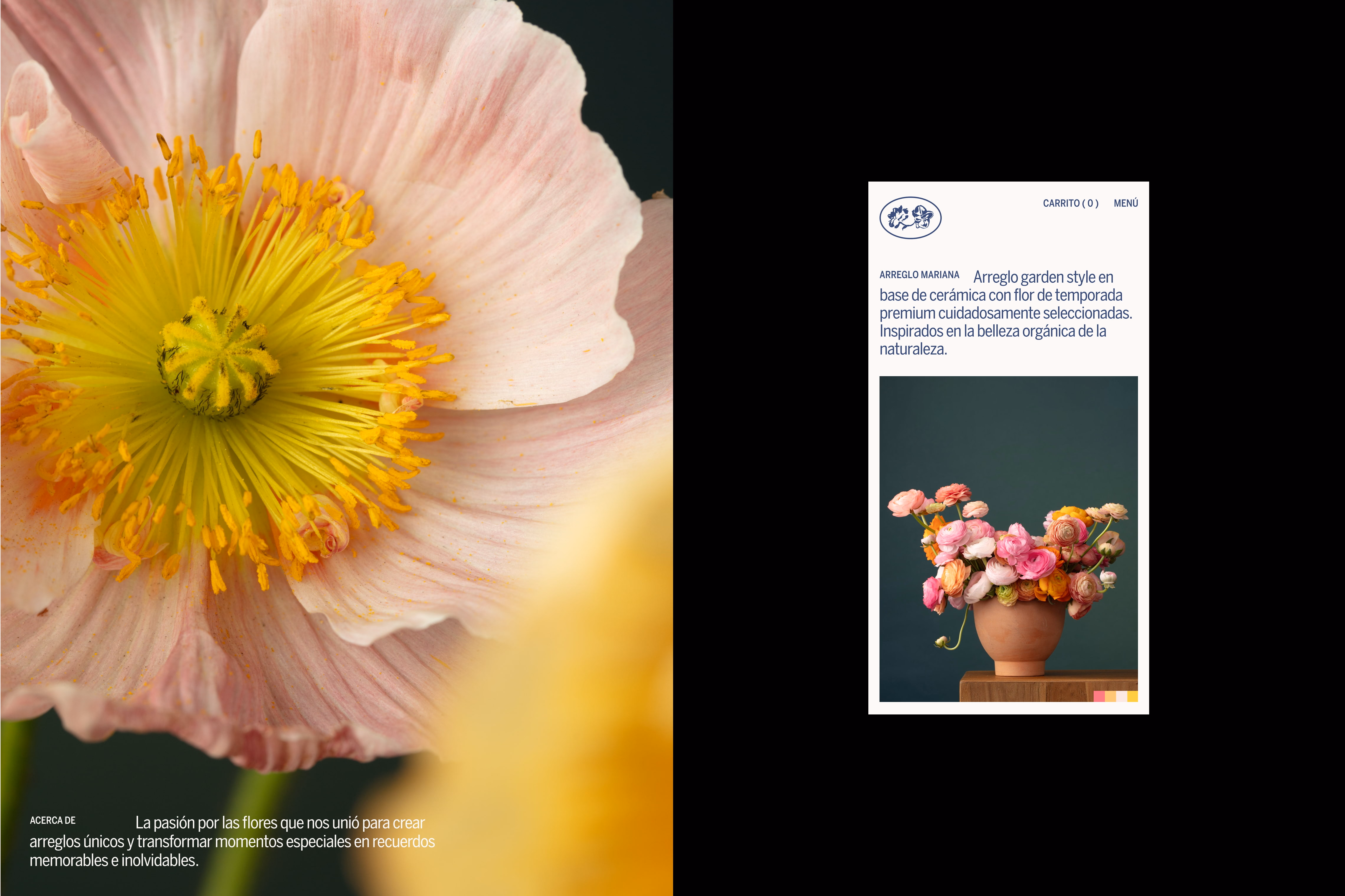 Nuestro enfoque principal fue asegurar una experiencia de usuario intuitiva, que a su vez toma inspiración en la elegancia de las flores. Partiendo del sistema de marca, creamos una tienda en línea donde espacios negativos enmarcan cada arreglo asemejando una galería, garantizando que cada pieza tenga su propio momento de admiración. Al dirigir la dirección de fotografía, nos aseguramos que las texturas, la naturalidad y el encanto de las flores se integren de manera fluida con el sistema digital. Aportando intención y reflejando el amor por las flores, las páginas de producto incluyen guías de cuidado para el mantenimiento y la longevidad.