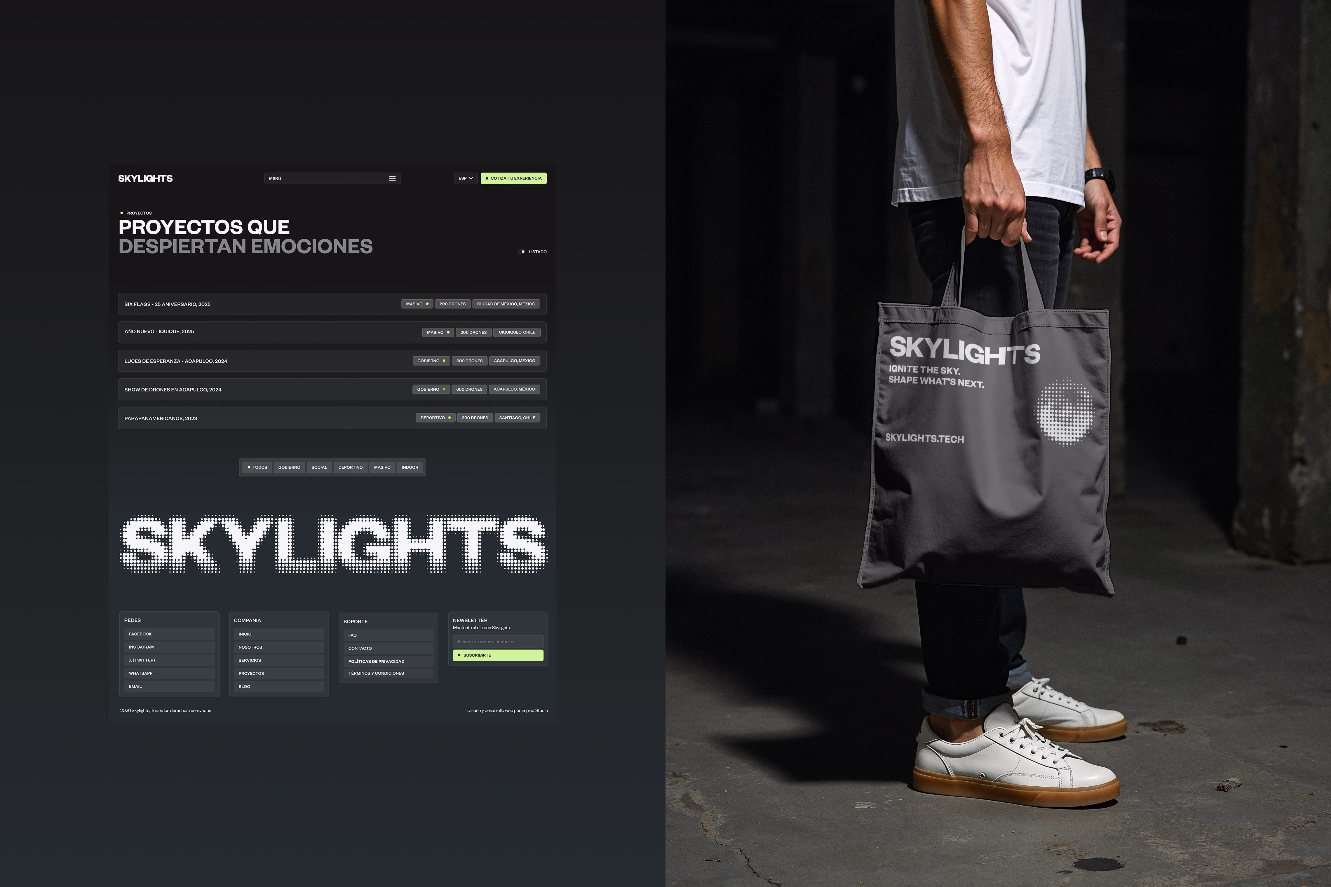 Skylights es una empresa mexicana dedicada a crear experiencias inmersivas en exterior, centradas en las historias e impulsadas por maestría técnica e innovación con drones. Con una presencia notable en Latinoamérica y Estados Unidos, su expansión exigió una identidad visual tan vanguardista como las experiencias que desarrollan.